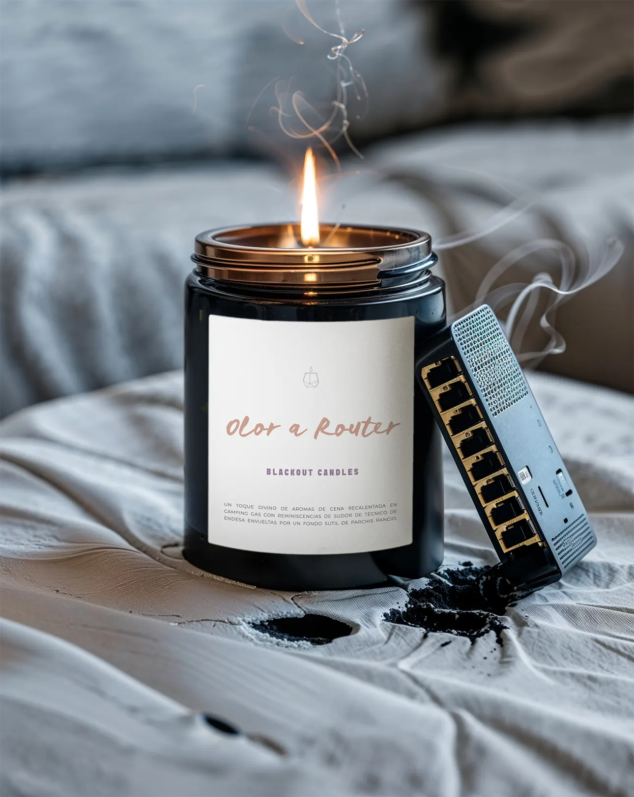 Inspirada en esos instantes en los que la conexión a INTERNET se pierde. Esta vela captura la esencia exacta del presente: intensidad, incertidumbre y un leve aroma a ROUTER SOBRECALENTADO que te transportará a tus días más analógicos sin perder las sensaciones más digitales.
